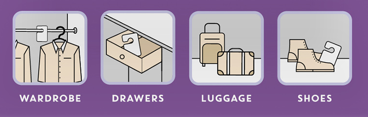 • Place anywhere: car, wardrobe, bathroom, door handle
