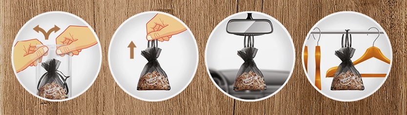 - Długotrwały zapach- drewniane zrębki uwalniają aromat równomiernie przez wiele tygodni