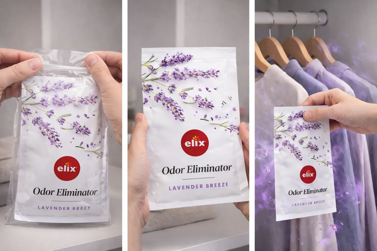 Open the foil packaging, remove the ODOR ELIMINATOR, and place it in the desired location, allowing it to work freely by gradually releasing fragrance and neutralizing unpleasant odors.
